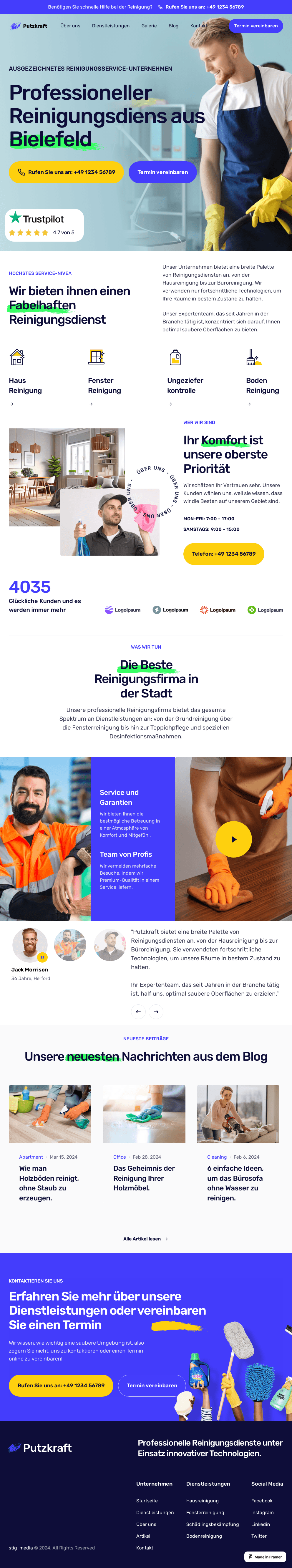 Die Homepage von Putzkraft ist klar strukturiert und führt den Besucher gezielt durch die wichtigsten Informationen: